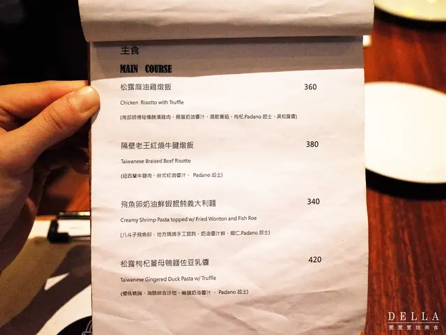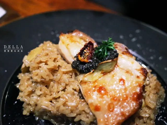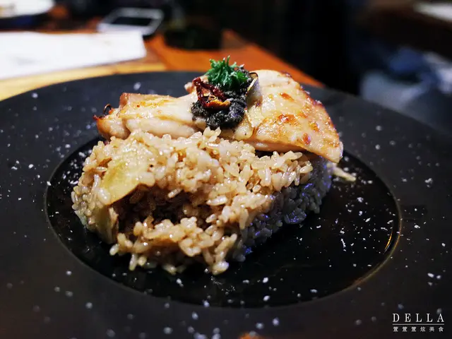 米飯中以麻油、薑片、藥膳醬汁調味,雞肉經過醃漬再香煎,最後撒上Padano起司
