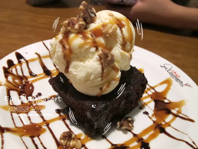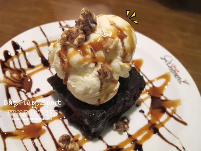 上方的香草冰淇淋單吃的會略嫌無味,但搭配上甜甜的布朗尼和焦糖醬可以完全綜合起過甜的布朗尼