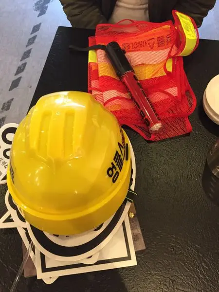 可以看到不管是牆壁還是身旁的裝飾物處處都充滿著三角錐,工業帽,指揮棒等等