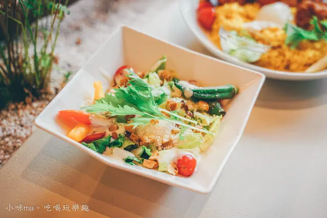 分量很足的沙拉有著各式各樣的新鮮蔬果跟堅果,中間一顆溫泉蛋陪襯,甜滋滋的凱薩醬跟香濃蛋液讓沙拉多了滑順口感