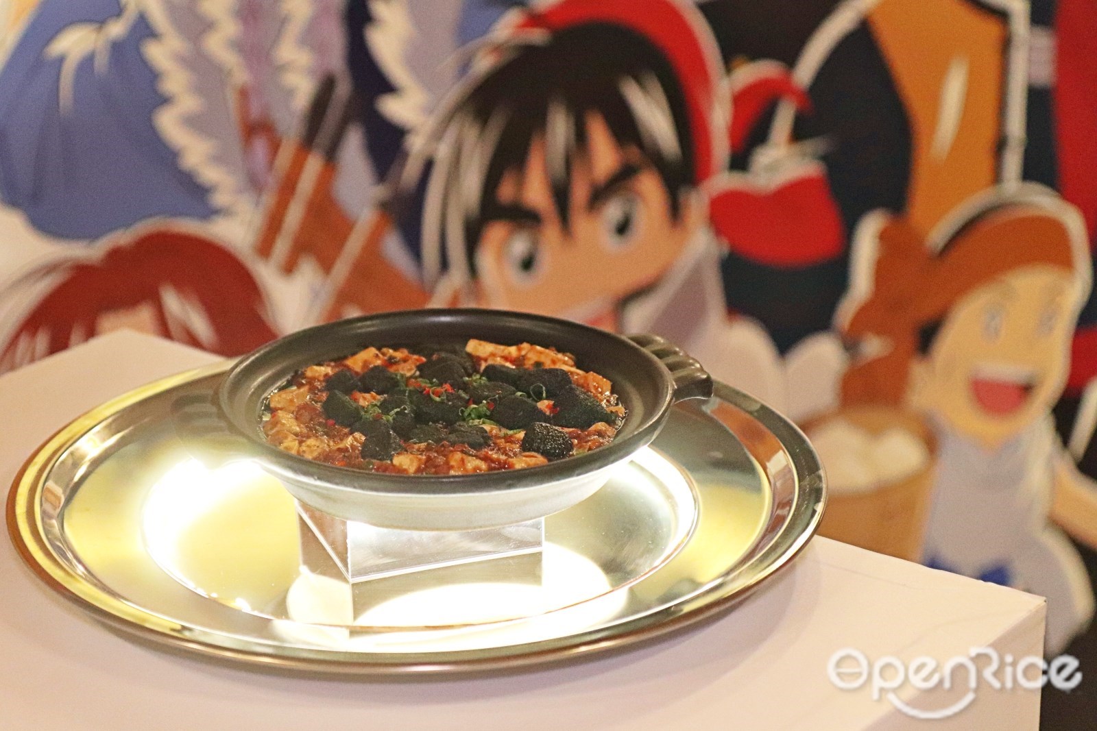 經典動漫《廚神小當家》席捲二次元與現實世界,饗賓集團今年秋天重磅掀開一場跨越次元的美食風暴。在劇情中,主角小當家「劉昴星」面對空前壓力,端出讓影迷印象深刻的「大魔術熊貓豆腐」,將料理創意與廚藝技巧發揮到淋漓盡致,美味到評審吃得滿頭大汗。而「開飯川食堂」就完美演出這樣牽動人心的瞬間,以竹炭黑豆腐炸過增加香氣與口感,加上滑嫩白豆腐,佐以特製花椒辣醬而成的麻婆醬汁,大火拌炒至香氣奔放,打造招牌「大魔術熊貓豆腐」,黑豆腐入口Q彈、白豆腐的柔軟、花椒香麻味在嘴裡滿溢,層次風味豐富,讓人一吃上癮,醬汁的鹹辣與花椒的香麻,每一口都滿足。