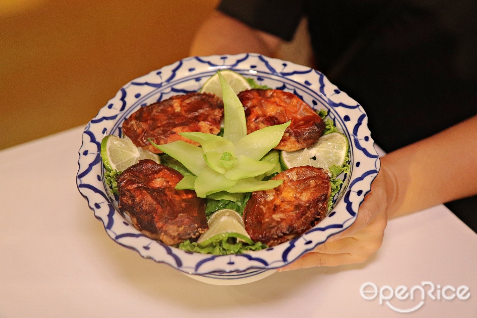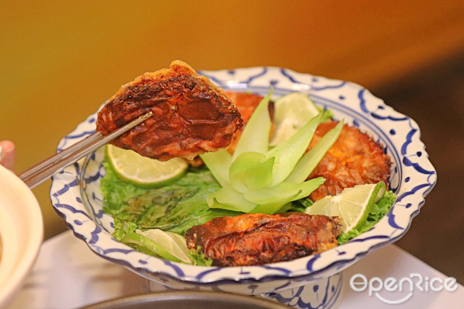 「饗泰多 泰式風格餐廳」端出七星刀「雷恩」的豪氣之作「頂級炸蟹斗」,金黃酥脆、視覺與味覺雙重滿足。