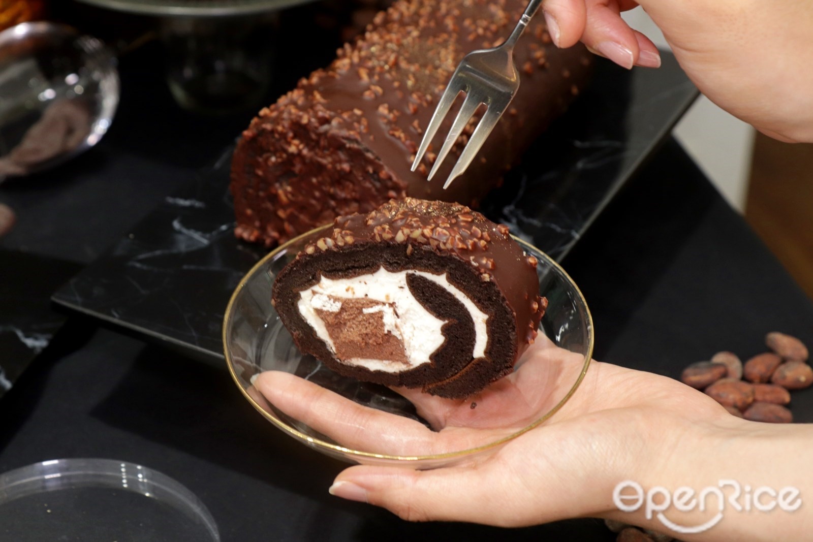 頂級規格「厄瓜多爾脆皮黑巧克力生乳捲」在特黑巧克力泡芙蛋糕上,由師傅耐心淋上杏仁厄瓜多爾黑巧克力,冷卻後形成披覆滿滿黑金的脆皮外觀,金粉縈繞為生乳捲寫下奢華姿態,內餡再捲入北海道奶霜、厄瓜多爾黑巧克力慕斯,兩者在舌尖上層層堆疊出極致奢華的濃郁。