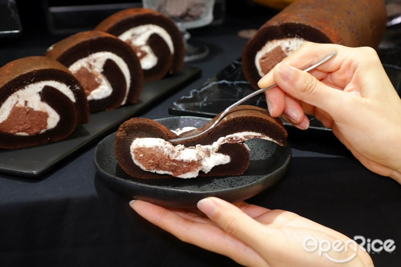 「厄瓜多爾黑巧克力生乳捲」特黑巧克力泡芙蛋糕鑲嵌珍貴無比的71%厄瓜多爾黑巧克力碎片,點綴上細緻的貝可拉可可粉一起烘烤,搭配清爽的北海道奶霜與厄瓜多爾黑巧克力慕斯,溫潤中帶有醇厚、濃重的可可底蘊,純粹中感受巧克力的悠長餘韻。