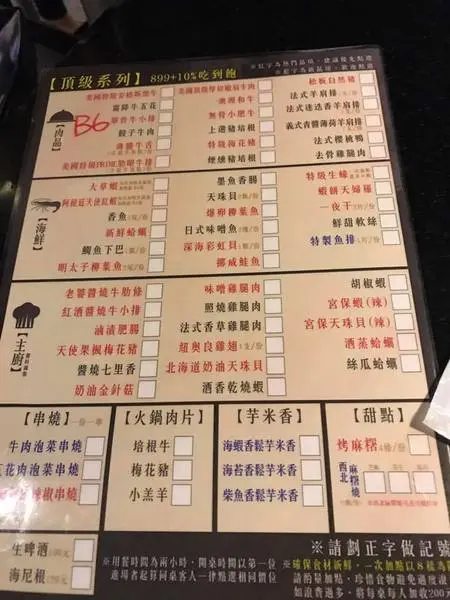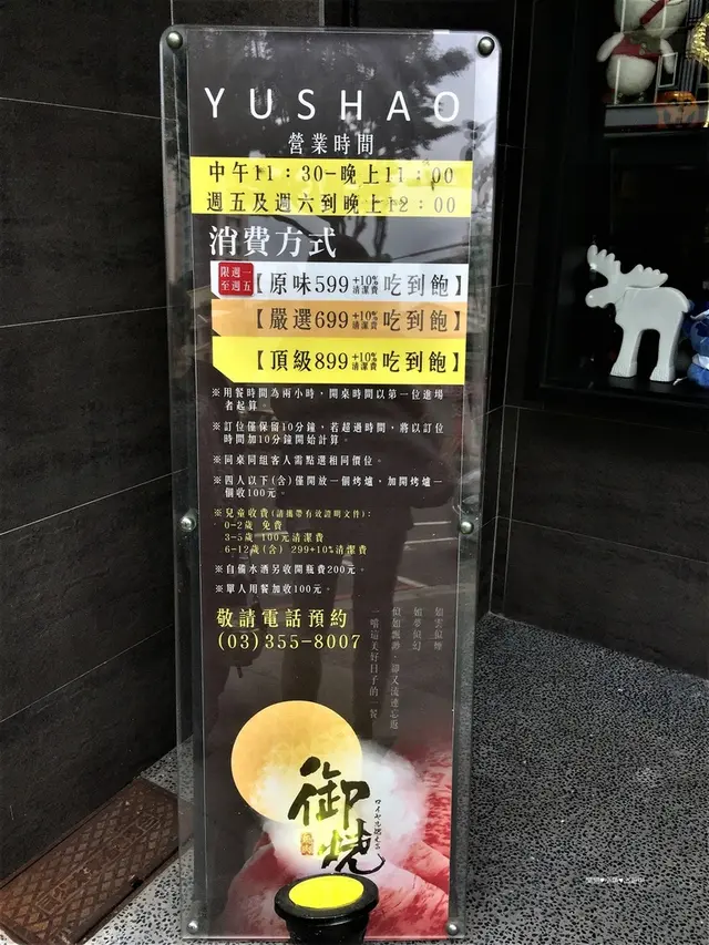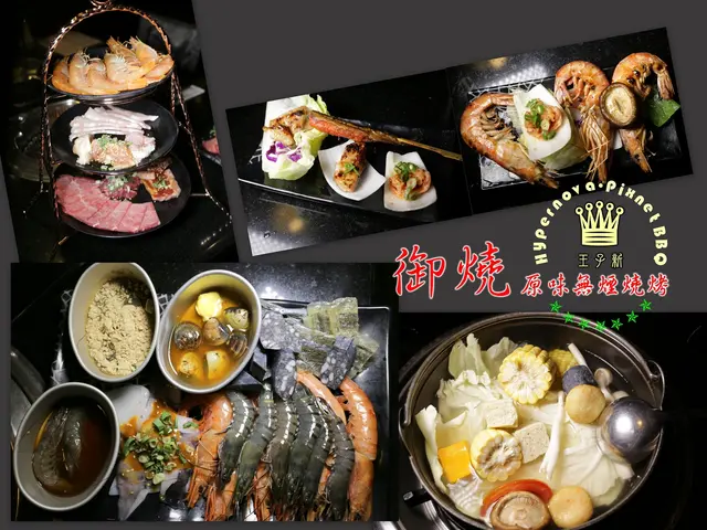 好久沒有吃過"吃到飽"的燒烤和鍋物了~今天來到桃園的「御燒原味無煙燒烤」,來體驗回味一下學生時期最喜愛的燒烤吃到飽餐廳。 御燒原味無煙燒烤,位於桃園市中正路上,臨近桃園市慈文國中和藝文特區,地點很好找,開車來的朋友也不用擔心停車問題,路邊有停車格,附近也有特約停車場(消費折抵1小時)。 店內非常寬敞,座位總共有128個,也有二間包廂,可分別容納12~24人使用,這餐廳的空間很適合團體聚餐或大型聚會同樂呢! 這裡的裝潢以黑色系為主,並搭配金色的燈飾,有一種低調的奢華感。牆面還放置肉品、美食的圖片,令人食慾大開啊!! 這裡用餐價位有三種,分別為599、699、899(服務費10﹪另計)我們今天體驗的是【頂級系列】899+10﹪吃到飽,可以點選的菜單如下 ↓↓↓ 【醬料區】採自助式,有醬油、辣油、蔥花…等,非常多種類可自由選擇調配。 【沙拉吧】也是採自助式的,有玉米、苜蓿芽、美生菜、葡萄乾…等。 【飲料區】有汽水、咖啡、果汁、冰沙…等可選擇,想喝什麼就拿什麼!! 桌子上有二個爐子,一邊是火鍋,一邊是烤爐,當我們坐定位後,服務生就會先幫忙在火鍋裡放上基本配料,再將裝有各式火鍋料的餐車推出,讓我們選擇想吃的火鍋食材,火鍋的湯頭是用蔬果熬煮的,所以喝起來帶有清甜感。 火鍋料的種類超多,其中一個推車放的是基本的青菜、各式菇類、玉米…等。 另一推車則是放各式的火鍋料,有丸類、餃類、豆皮、王子麵…等。只要告訴服務人員想吃的配料,他們都會幫忙夾給你! 介紹了這麼多,終於來到重頭戲了!!最期待的肉盤總算出現了~~此行之目的就是要吃燒肉飽的不要不要的啊~滿滿的肉品和海鮮就如同被放在盤上的藝術品,等著我將它們都解決掉!!! 桌上放著四種適合燒肉使用的調味粉,分別是七味唐辛粉、孜然粉、胡椒鹽、玫瑰鹽,可依喜好自由使用,只不過,蛋寶還是最愛鹽味原味!! 【薄鹽牛舌】平日吃燒烤時,也喜歡點一份牛舌來吃!其軟脆的口感常令人難忘啊~薄片狀的牛舌,經過燒烤逼出油脂後,香味逼人,沾上一點點玫瑰鹽提味就很足夠了。只是這份牛舌烤得過熟了~變得較有嚼勁,若不怕生一點的朋友,可試試5分熟~更能嚐到其軟嫩感! 【美國特級prime肋眼牛排】美國特級prime肋眼牛排送來時為完整的一塊,厚度約1公分,上桌時已先幫忙分切成好食用的份量。整塊牛排放到烤網上,感覺好滿足,肋眼牛排油脂較為豐富,咬下時較為多汁,軟嫩中帶點咬勁~推! 【松板自然豬】、【照燒雞腿肉】松板豬烤到焦脆的口感也是我的最愛,只可惜服務人員烤的還不夠久~~所以,肉質的口感較偏軟嫩,但依然可以吃到肉的多汁香甜~推! 照燒雞腿肉已先用特製的照燒醬醃過,雞肉柔軟多汁,口味吃起來甜甜鹹鹹的,很不錯呢!大推! 這是我們今天的服務人員~服務超好也很細心呢!會告知我們肉品的特色,還有推薦的品項,也會隨時更換乾淨的烤網,讓我們吃的安心,重點是還全程幫我們服務~~超貼心!這是因為我們是平日中午用餐,服務人員才較有空幫忙協助,但平常用餐人數較多時,他們也會適情況幫忙哦!! 這個拼盤放了三種不同的肉品,從左到右分別是單骨牛小排、澳洲和牛、安格斯黑牛,以下會分別介紹其口感~(請耐心等待) 【單骨牛小排】單骨牛小排是採厚切的方式,可同時吃到筋和肉的雙重美味~但相對的也較有嚼勁!!這牛小排因有厚度,所以燒烤的時間較為久,整體的肉質吃起來乾柴~很難咬~載牙套中的姐姐完全咬不動,無法吃啊!!只好要求服務人員幫忙剪小塊一點~以方便食用,結果還是咬不動……,知道意思了吧?! 【澳洲和牛】和牛是採切塊的方式出場,燒烤後油脂仍然豐沛,中間柔軟,咀嚼後油脂和肉汁結合在一起,只要沾點鹽就很好吃了!! 推! 【美國特級安格斯黑牛】薄片狀的安格斯黑牛,只要放到烤網一下下就可以拿起食用了!雖然肉質本身的油脂較少,卻能吃到牛肉本身的彈性與質感,(有點像滷牛腱的口感)不需太多的調味反而更能突顯其美味。 【特級生蠔】 特級生蠔約有十公分大,烤到一半出水後,服務人員幫我們加入蒜泥繼續燒烤,更能帶出生蠔的鮮甜味~好吃! 【明太子柳葉魚】明太子柳葉魚,口感真是讓人驚豔!!沒想到烤完後,柳葉魚的肉質細緻柔軟,明太子泥鹹香鮮甜,入口後明太子帶點彈跳感,滋味很棒!!大推! 【阿根廷天使紅蝦】、【天珠貝】、【深海彩虹貝】 天使紅蝦~共有四尾,且超大隻的,都快跟盤子一樣大了!所以我們決定一半用燒烤的,一半放入火鍋中煮,可以品嚐不同料理方式的口感。經過比較後發現,天使紅蝦用燒烤的方式,肉質會更香甜緊實呢!推! 天珠貝~烤完後彈性很佳,咬下後中間鮮嫩還含有水份,Q彈Q彈,整體的口感很獨特! 深海彩虹貝~中間的肉質柔軟,烤完後仍吃的到海鮮鮮甜的口感~ 吃完一輪後,肚子已經開始飽了~但是,怎麼能夠只吃這樣呢!那就太對不起自己了!!所以詢問服務生還有沒有什麼人氣單品尚未吃到,再搭配喜愛吃的食材,莫名其妙的又點了以下這一輪!!默默的將褲帶鬆開一格…… 【霜降牛五花】據說這是客人最愛加點的品項,當然要試試囉!果然肉質軟嫩油脂豐富,能讓人一口接著一口,都忘了已經飽了!推! 【北海道奶油天珠貝】、【胡椒蝦】【宮保蝦】、【新鮮蛤蠣】這四道食材,都已先放入烤盒中,讓人方便燒烤,不用一直盯著看,真的很貼心呢! 北海道奶油天珠貝~咬起來Q彈Q彈,還帶有奶油的香氣與甜