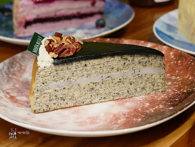 和清爽系的藍莓千層完全相反調性的則是芝麻千層,一入口就可以感受到滿滿芝麻香往鼻腔衝,濃郁綿密的口感再加上中間Q軟的麻糬,也是我個人特別喜歡的一款。