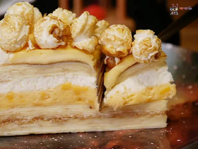 芒果千層是季節性商品,中間夾入芒果醬和香檸蘋果丁,上面又鋪了芒果卡士達醬和芒果果粒,和我們過去吃到塞滿芒果的蛋糕很不一樣,走的是比較精緻的路線,很受到我們朋友間的好評呢!
