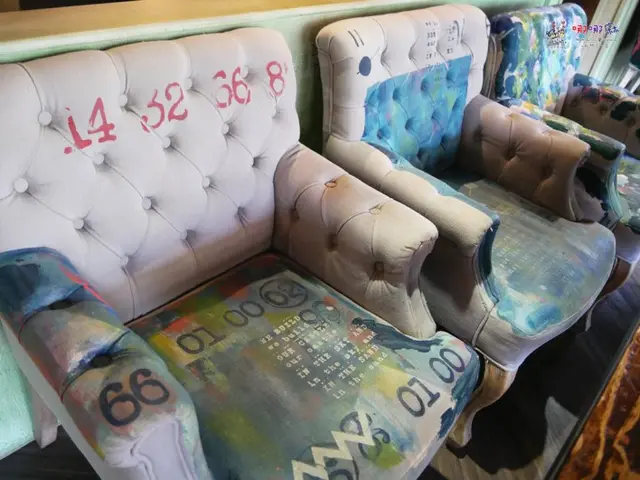 裡面有一組椅子我覺得很有趣,本來以為是布料的花紋,摸了以後才發現竟然是油畫顏料,店家跟我們說那確實是用油畫另外畫上去的圖案,也太酷了,不知道誰想出來這麼有趣的主意。