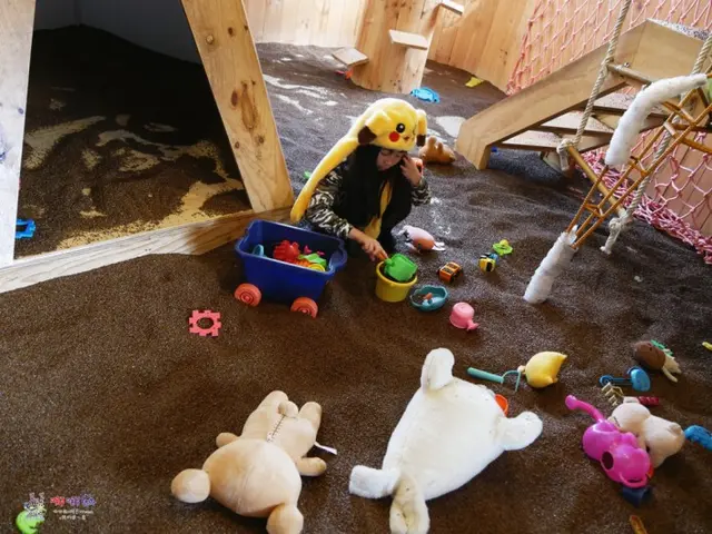 當然最讓小孩興奮的是遊戲區囉!裡面用的是不會沾到身體上的決明子沙,我想每個小孩來到這邊都是先往遊戲區衝吧!不過請不要拿水進去,決明子不是真的沙子是一種種子,澆水會發芽啊!