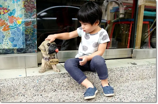 也因此在還不得其門而入之前,我跟兒子只能杵在門口跟這隻"假的"狗企投~挺自得其樂的