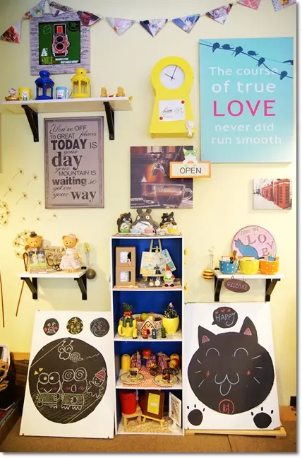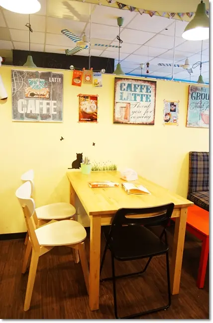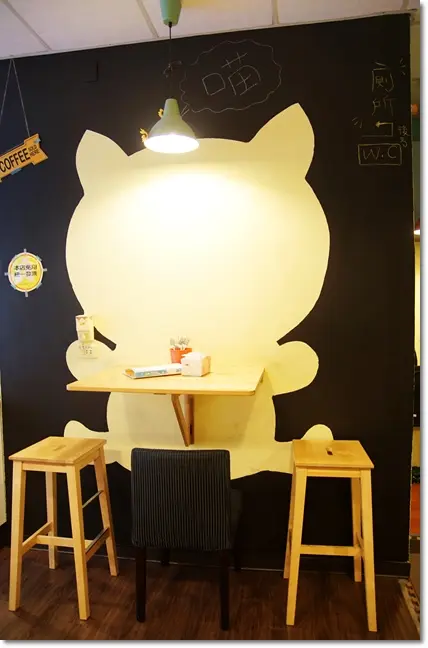 在用餐座位中,我超喜歡這面牆的佈置,有一隻超可愛的大貓!還寫個「喵」咧~