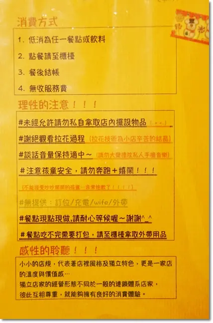 另外還有一些用餐規定請大家自己看,我目光是完全集中在:不能接受吵吵鬧鬧的孩童