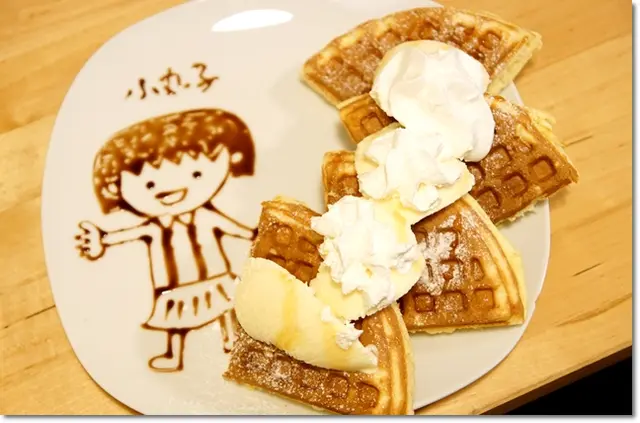 厚實的4塊鬆餅配上淋上焦糖醬的冰淇淋及鮮奶油,還有用巧克力醬畫的"小丸子",超超超吸晴的啦!