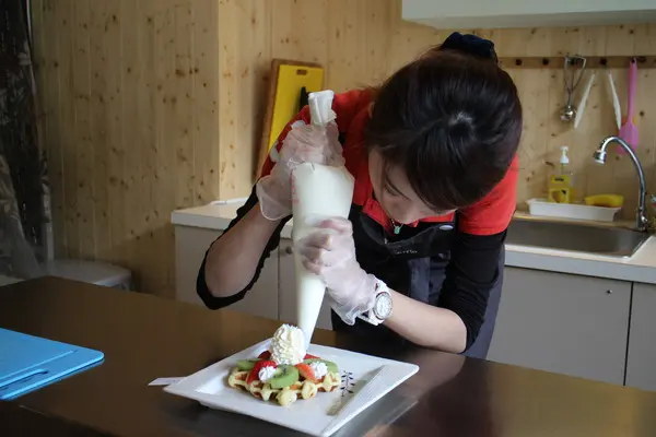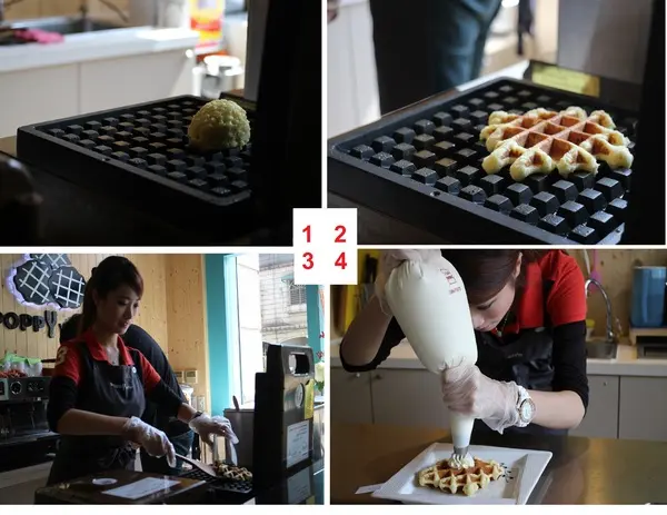 不會緊迫盯人,貼心送餐,且店員都是帥哥美女! 特別請求店家讓我拍他們鬆餅的製作過程,店員大方不藏私的讓我拍攝。先是挖一小球麵糰,然後放在鬆餅機上,烤幾分鐘後拿出,店員先開起小電風扇散熱,然後加上裝飾。
