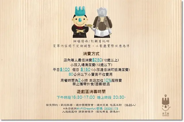 兒童餐(限12歲以下)訂價等於低消,如此一來可以不用算半天,看怎麼點餐才不會被收到清潔費