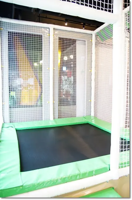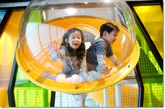 光線明亮的超大球池區,裡面有兩款溜滑梯,其中彎道溜滑梯溜下的速度很快,超刺激啦