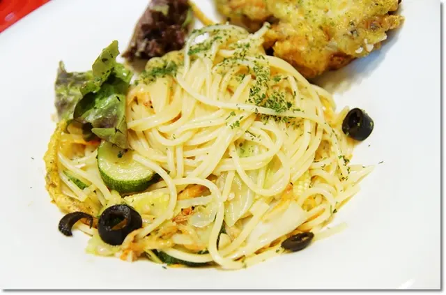 義大利麵裡除了櫻花蝦之外,還加入了洋風的黑橄欖、生菜以及台式的高麗菜、黃瓜、玉米筍