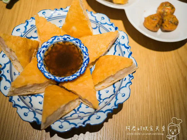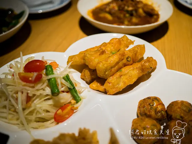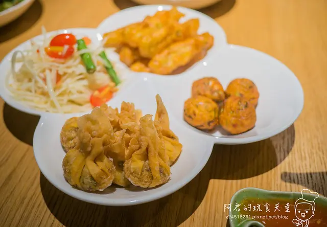 ▼Thaipas拼盤,三種炸物加上涼拌魚露青木瓜,除了青木瓜是固定的以外,另三種炸物都是由主廚每日特選的,今天的是炸鳥蛋、炸瓠瓜以及炸打拋豬餛飩,餛飩外皮炸的超酥,而且不油膩。
