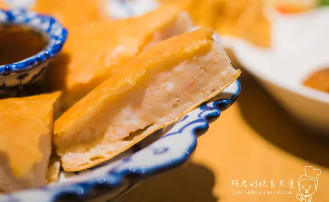 ▼月亮蝦餅,手工拍打的蝦泥,包裹在又香又酥脆的餅皮之間,咬下去喀滋聲響之後,接著來的是內餡的多汁與鮮嫩,中間是自製的梅子醬,沾上後的酸甜滋味令人愛不釋手。