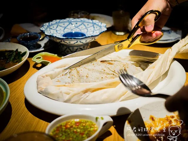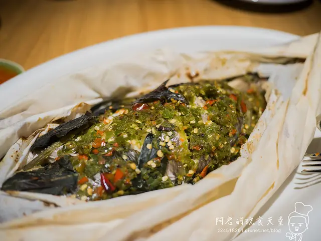 ▼緊接著是烤紙包魚,需要約45分鐘蒸烤,在上菜後,服務生會拿剪刀將上面包覆的紙給剪開。
