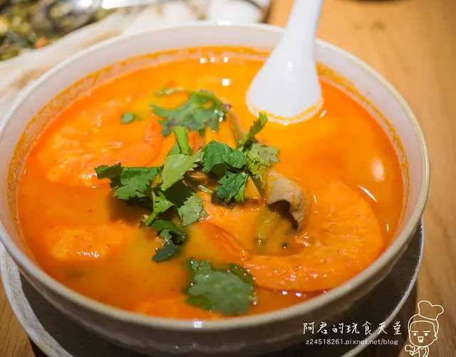 ▼酸辣蝦湯,用乾辣椒、小辣椒、油蔥酥磨製而成的辣椒膏,酸辣湯汁搭配鮮蝦、菇類,湯頭又酸又辣,雖然道地口味可能就是這樣,不過在喝了幾口後還算是可以接受的。