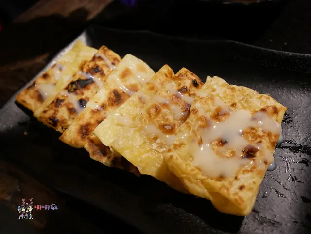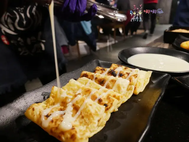 剛剛起司洋芋和起司條旁邊都有一片一片的東西,就是這個香烤乳酪餅,其實就是全聯會賣的酥皮的小塊板,一邊烤的過程中就可以聞到奶油香,又香又酥非常好吃,店員說除了單吃也有客人會拿來包肉增添肉的口感。