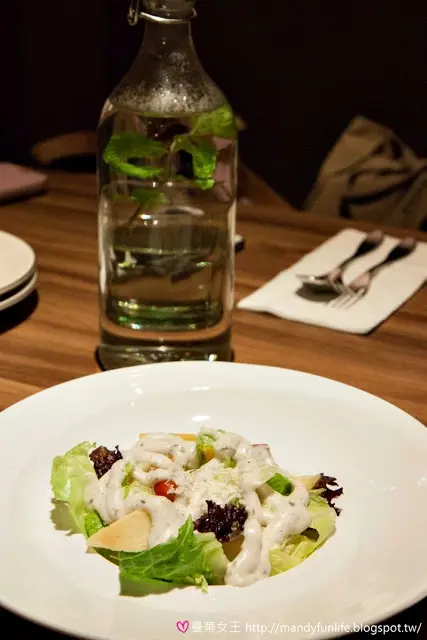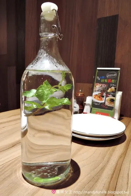 桌上的水瓶裡放著義式香草,不過嚐起來~ 水的味道倒是沒有什麼特別不一樣的地方