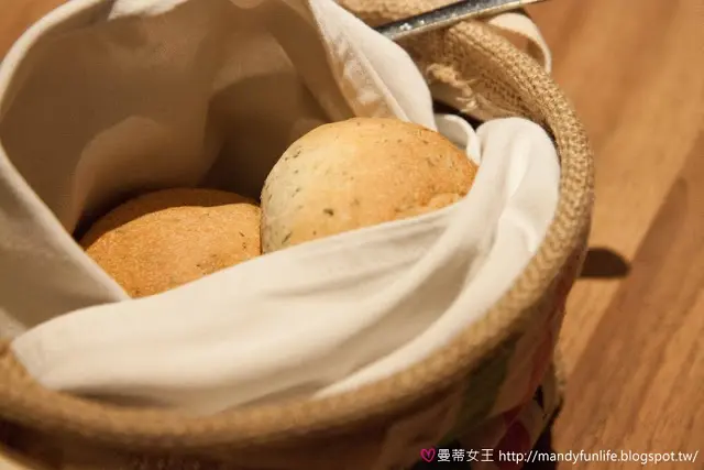 首先上桌的是「義式香料麵包」,用麵包布包裹著保持著熱呼呼的溫度!