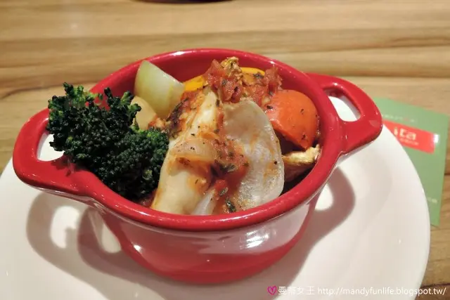 「爐烤季節熱沙拉」,是以洋蔥、甜椒和杏鮑菇為主再搭配義式番茄紅醬調味的溫熱沙拉,口味上清爽,也可以滿足不吃生菜的人。