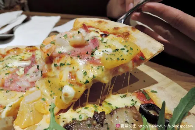 「羅馬豔陽披薩」,主角有蝦、火腿和鳳梨片,口味類似夏威夷披薩,