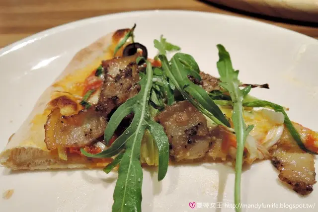 「有豬來襲披薩」,是一道中西合併的創意披薩口味,薄皮披薩餅皮抹上義式番茄紅醬、