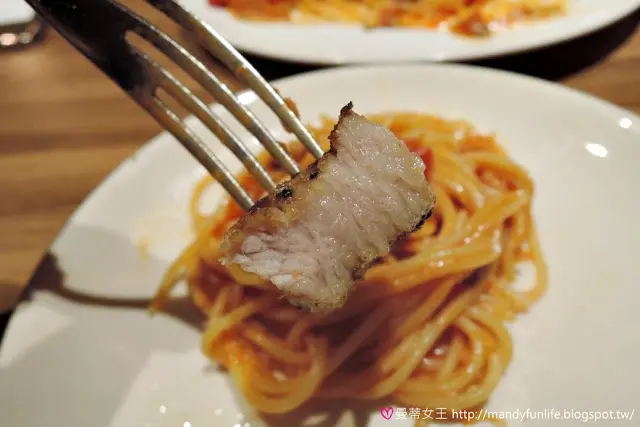 豬排旁邊原來是搭配「泰式酸辣醬義大利麵」,不過我個人換成了「義式紅醬義大利麵」,大家也可以視自己喜歡的口味做調整。義大利麵口感Q彈,控制得很不錯!