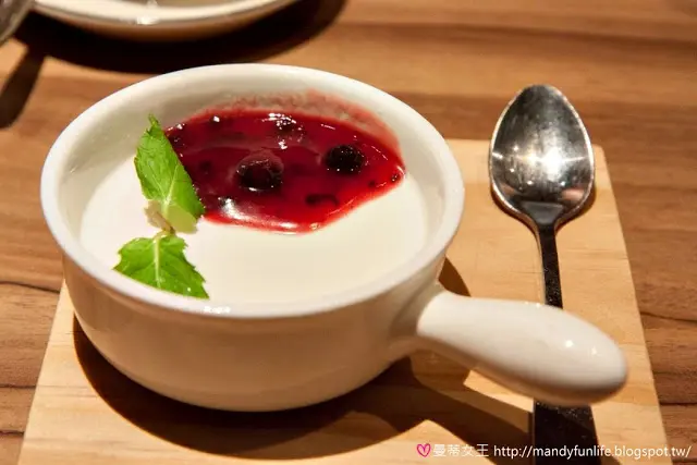 奶酪口感滑順、配上略酸的野莓果醬一同品嚐,不甜不膩~