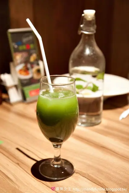 「綠色奇蹟」,是地瓜葉搭配蘋果和鳳梨打成的蔬果汁,嚐起來是酸甜的清爽口味,不錯~~