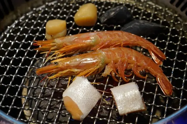 一同來烤上的天使紅蝦這麼大尾,前頭的鬍都有處理過烤起來就是棒棒的