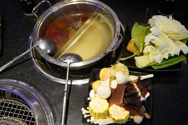 火鍋部份有三種湯頭可選擇,昆布、麻辣、泡菜