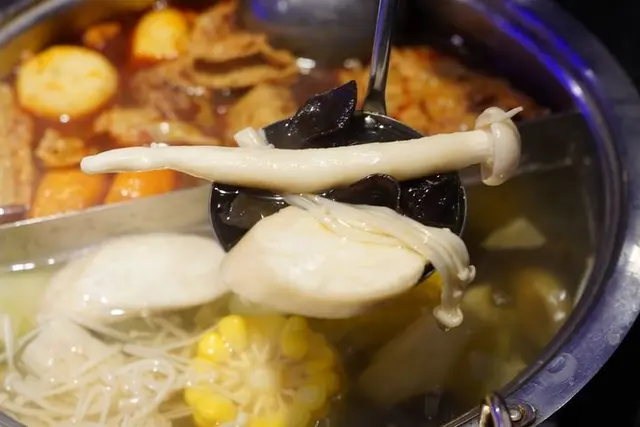 火鍋料超多的包含有杏鮑菇、玉米、木耳、泡菜、南瓜、青椒