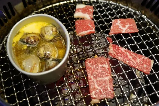 九孔鮑魚、酒蒸蛤蠣、牛肉泡菜串燒、五花肉剝皮辣椒串燒