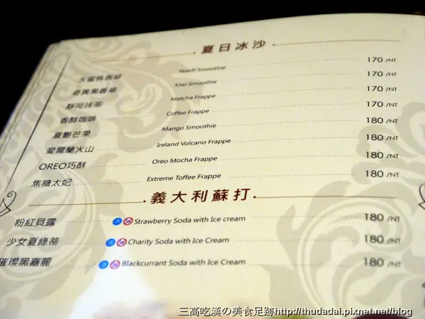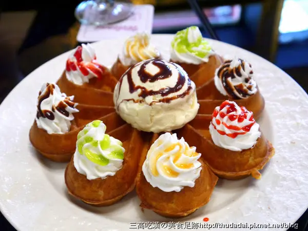 選了冰淇淋口味,水滴花瓣模子,四周擠上鮮奶油與果醬等物,相當賞心悅目。