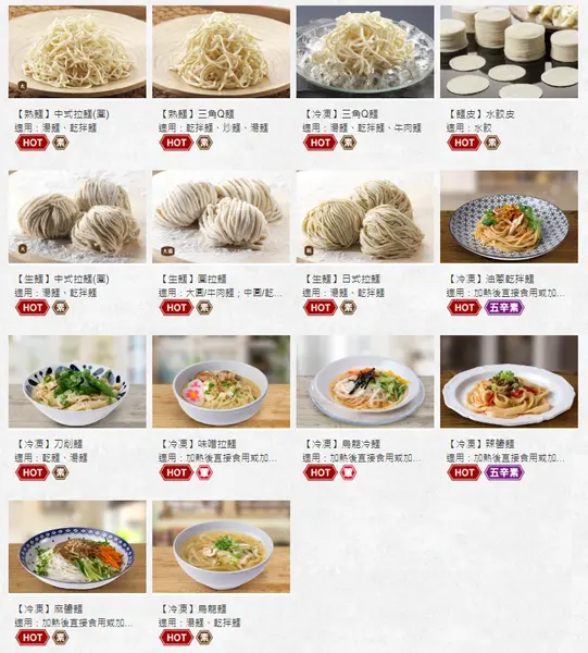 官網商品分為「生麵」、「熟麵」、「麵皮」、「冷凍」幾大類別,產品一目了然,