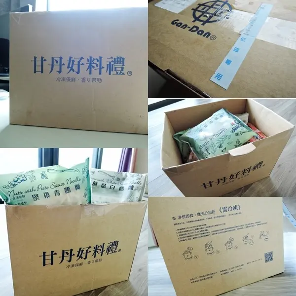 低溫宅配的紙箱,印著大大的品牌名稱,箱子側邊還有料理教學步驟