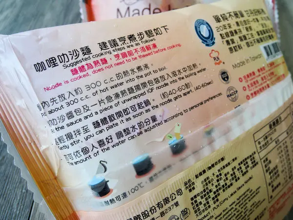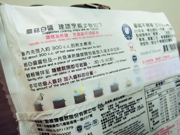 包裝的背面則是「烹煮步驟的文字+圖示」、「成份」、「熱量」、「品質認證」等。