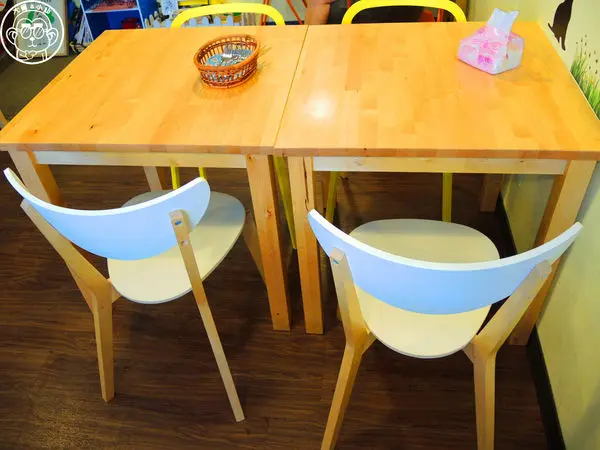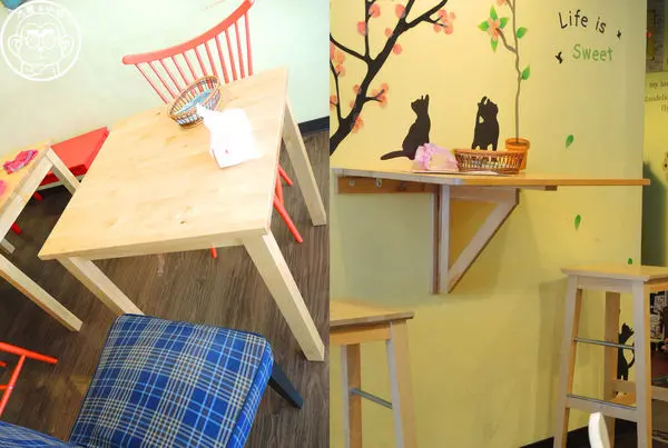 座位共有六張桌子、16個座位,包括釘在牆上的桌子