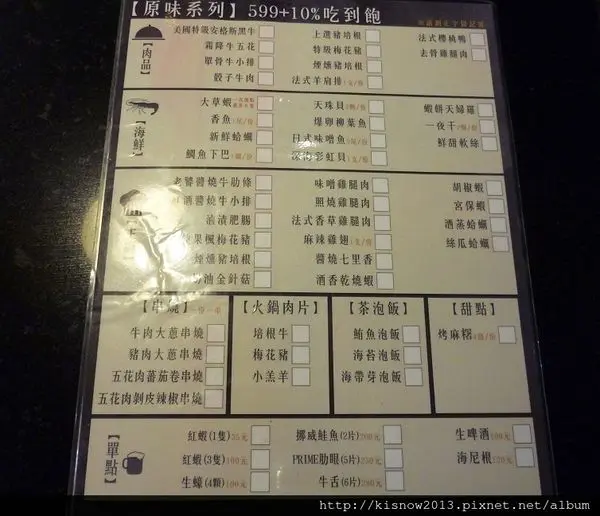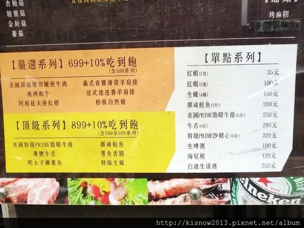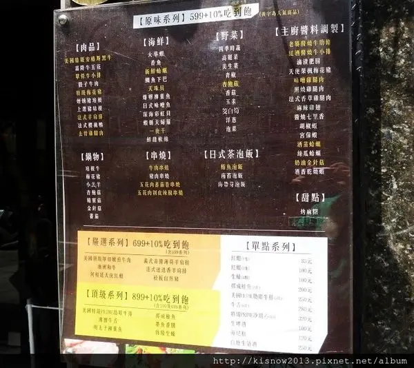 這家店的燒烤料理分成三種價位,包括599+10%,699+10%,以及899+10%,各分為原味系列,嚴選系列,頂級系列,每一種價位所提供的菜色不同,這次以899+10%吃到飽菜色為主,加點菜色可以包含599和699的系列.