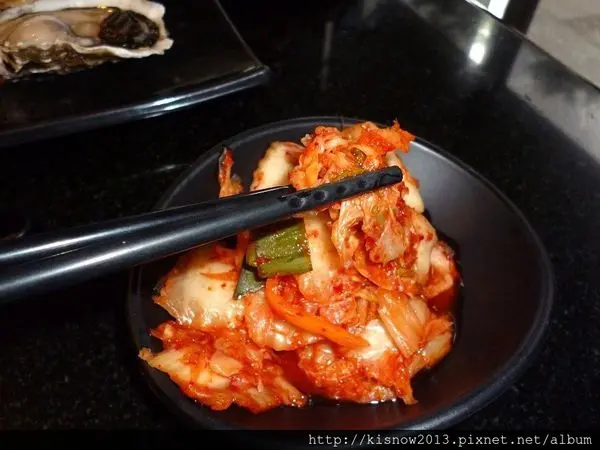 順便再來點泡菜開胃一下,泡菜是韓式泡菜,口感偏酸,辣度不會太重,吃完油膩的燒烤肉類,可以平衡一下口感.