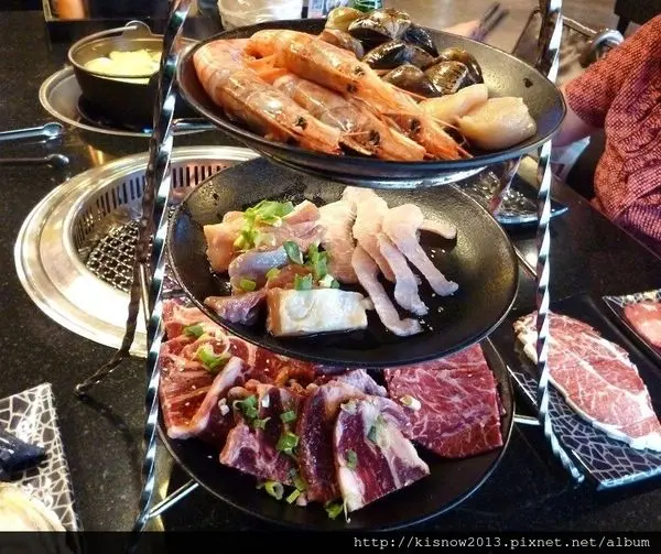 服務人員先送上豐富的三層菜盤,好像下午茶的感覺,整体看起來精緻美觀,除了精緻的三層菜盤,隨後陸續送上牛舌,助眼牛排,特級生蠔等食材.佔滿半邊桌子,因為東西太多,也太豐富,一時之間不曉得要先烤哪一道菜?