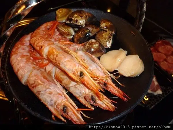 天使紅蝦外表鮮紅色,体型較大,搭配蛤蜊和干貝一起放在烤爐炙烤.