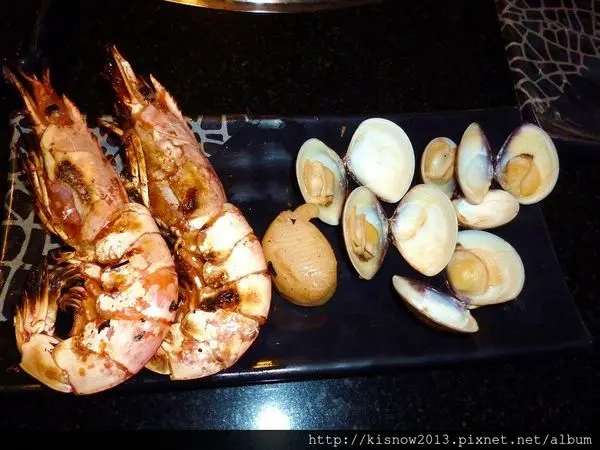 天使紅蝦烤過後必須自己細心的剝殼,外殼較硬又厚,吃起來的口感,肉質稍具彈性,而且滋味鮮甜,雖然肉質看起來不多,因為鮮甜的滋味,咬在口裡相當滿足.蛤蜊經過炙烤,在口感上具有相當濃郁的海味,汁液較多,滋味有點偏鹹.干貝滋味鮮美,肉質具有相當良好的韌勁.