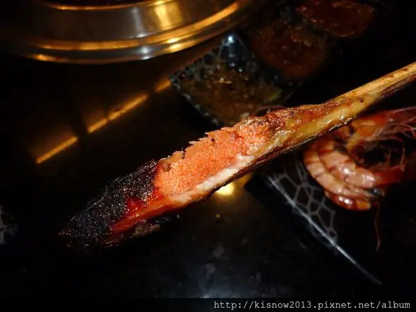 明太子柳葉魚看起來像長條型的魚干,經過火爐炙烤,柳葉魚的外皮吃起來的口感薄酥,內層含有少許魚剌,魚肉部份較少,帶有一點鹹味,比較精彩的部份是內層紅色的魚卵,口感上類似蝦卵,雖然有點偏鹹,但滋味相當可口.