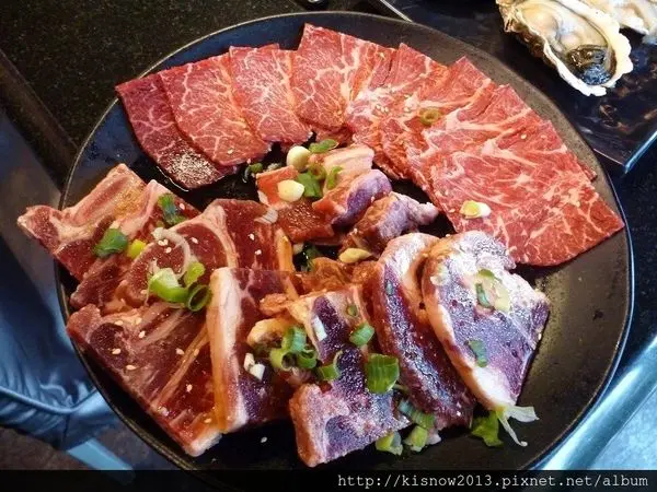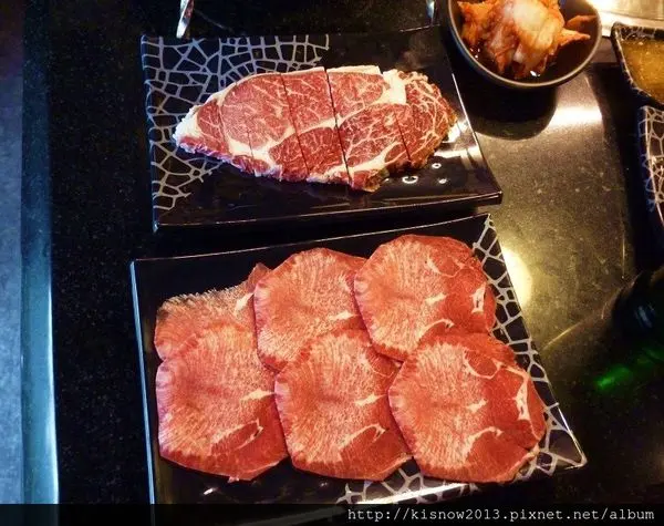 肋眼牛排和牛舌都是呈現鮮紅色,牛舌沒有明顯油花分布,助眼牛排油花分佈相當明顯,松阪豬肉和照燒雞腿肉都是呈現粉色.